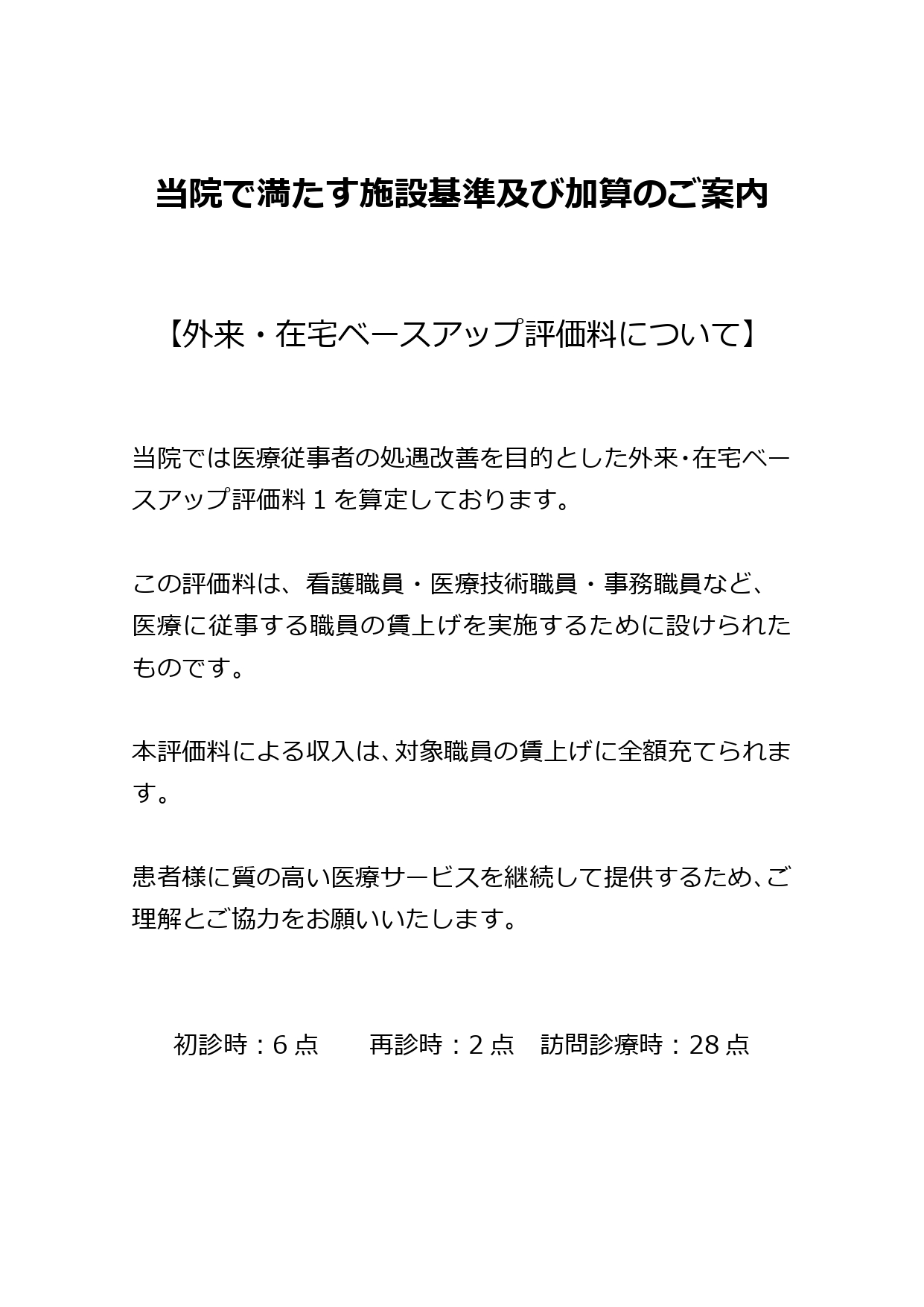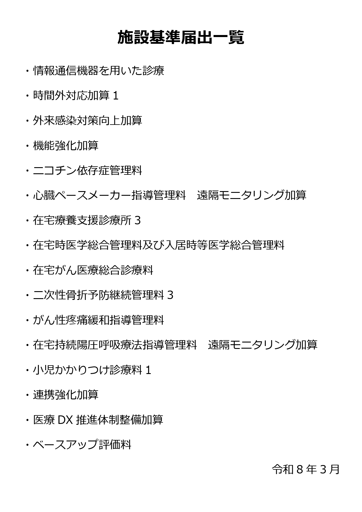 院内掲示物 診療案内 指定医療機関 施設基準届出 外来・在宅ベースアップ評価料 個人情報保護方針 個人情報の取り扱い 機能強化加算 小児かかりつけ診療料 外来感染対向上加算 夜間早朝加算・明細書発行体制加算 時間外対応加算 長期処方・リフィル処方箋 医療DX推進体制加算